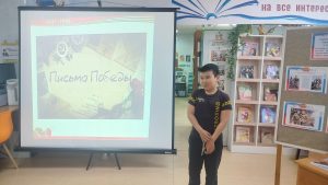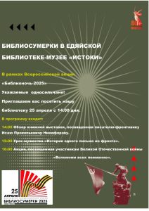 25 апреля в рамках всероссийской акции»Библионочь-2025″ в нашей библиотеке-музее «Истоки «были проведены библиосумерки «Свои герои».В программе которого вошли показ презентации о писателе -фронтовике И П.Никифорова, урок истории «Письмо солдата с фронта», здесь был рассказ об участнике войны Иларова Афанасия Акимовича, прочитали его письмо родным. В конце мероприятия ребята рассказали о своих родных -участниках войны. Всем было интересно и познавательно. Потом все вместе сфотографировались на память о нашем мероприятии.