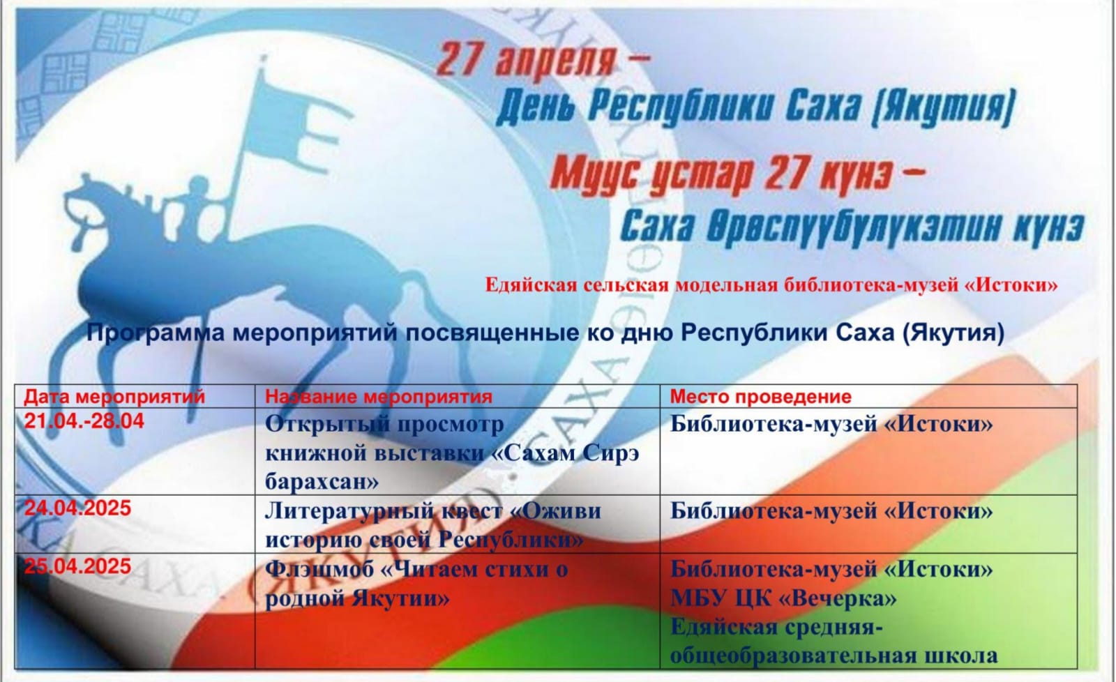 Будет проведена литературная игра квест «Оживи историю своей Республики», для начальных классов Едяйской школы, также совместно с Едяйской средне общеобразовательной школой и МБУ ЦК «Вечерка», будет проведен флэшмоб «Читаем стихи о родной Якутии». Желающие присоединится к празднованию Дня Республики Саха (Якутии) мы вас ждем в нашей сельской библиотеке.